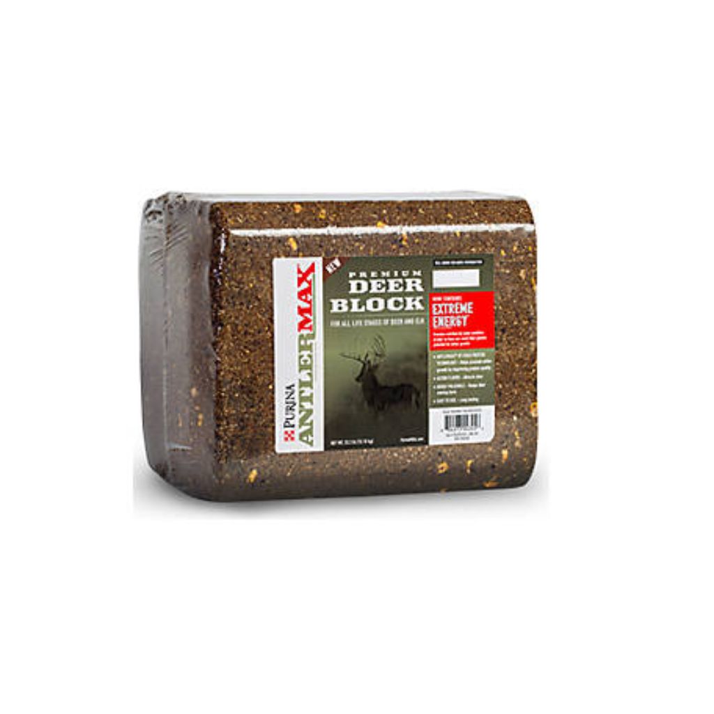 Purina Antlermax Deer Block is a premium, 18% protein, water-resistant, fortified, year-round supplemental feed block designed to enhance the deer's natural forage diet without the need for a f