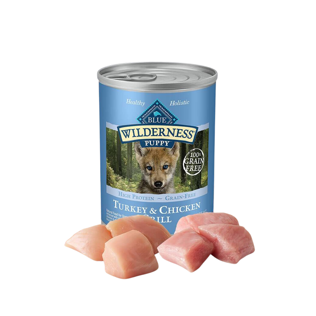 Satisfy the spirit of the wolf inside your puppy with meat-rich BLUE Wilderness canned food. This delicious recipe starts with high-protein turkey and chicken and features DHA, an important fatty acid found in mother’s milk, to aid cognitive an
