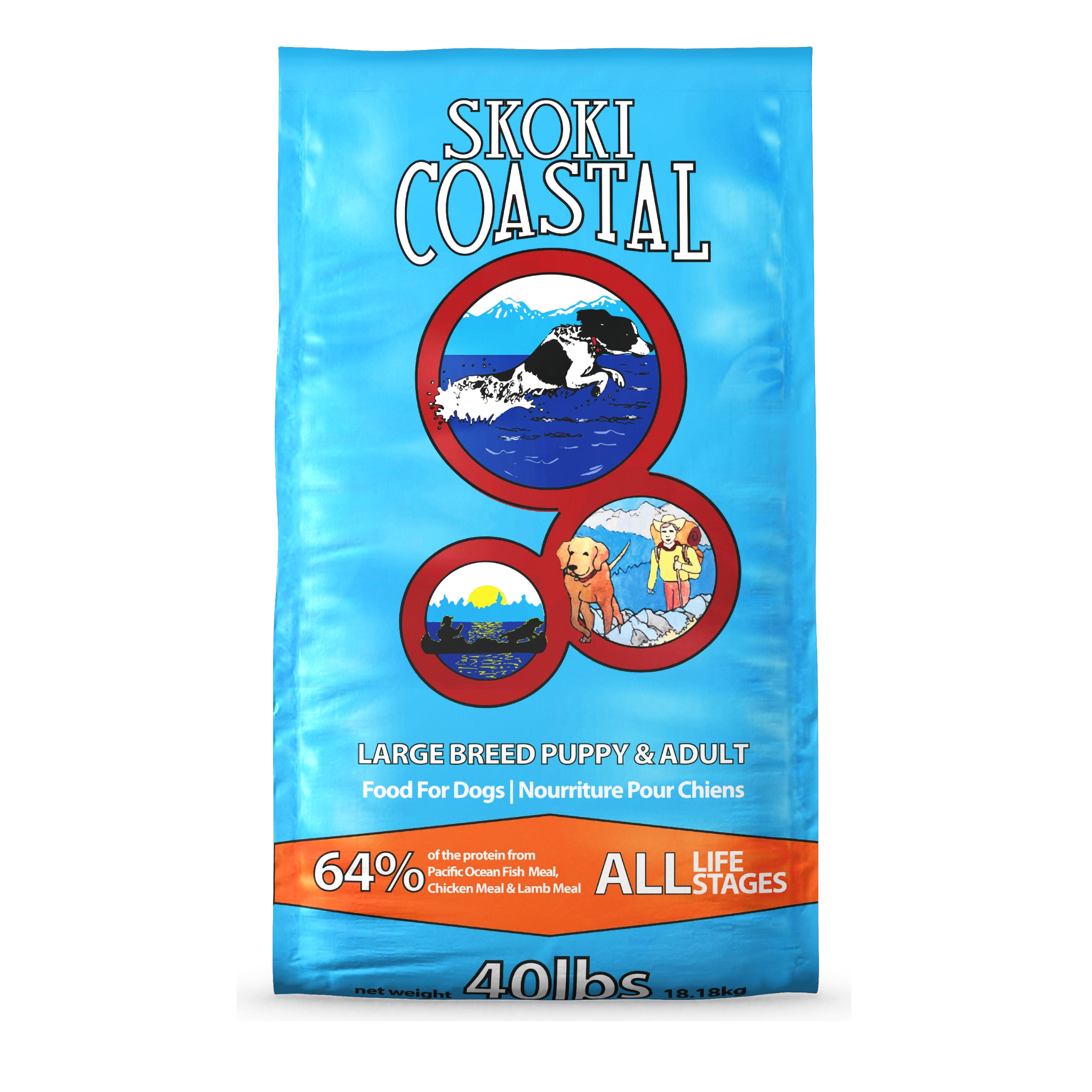 Skoki Coastal, a FirstMate manufactured formula, is a high quality, high value, corn and wheat free dog food diet. Using quality ingredients, regionally sourced from within the Pacific Northwest, Skoki Coastal is a fish forward diet which also in