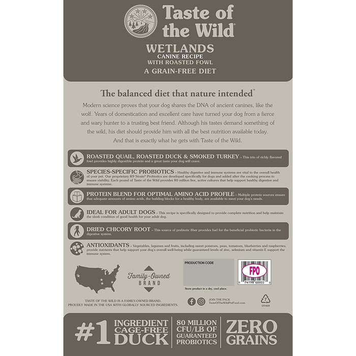• Taste of the Wild Wetlands with roasted Fowl; real Duck is the #1 ingredient; optimal amino acid profile, protein rich for LEAN, STRONG MUSCLES