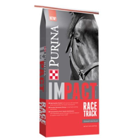 Purina Impact Horse 14% RACE TRACK is a sweet grain mix for race horses, with 14% protein. To be fed with medium to high quality hay or pasture. Added fat supports healthy hair coat.