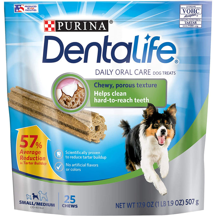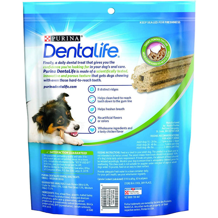 Discover a different way to help clean your dog's teeth with Purina DentaLife Daily Oral Care small/medium adult dog treats. Each treat features eight distinct ridges to clean right down to the gumline, including hard-to-reach teeth. The porous texture contains thousands of air pockets, and the chewable design keeps him busy while he works to keep his teeth clean. Let him delight in the tasty chicken flavor that makes each of these dog snacks a true treat. With a 57% average reduction in tartar buildup, these adult dog treats deliver a breakthrough clean you can both smile about. Serve them according to the feeding instructions based on his weight. We craft these tasty dog chew treats with wholesome ingredients and without any artificial colors or flavors, so give your dog a Purina DentaLife dog treat whenever he deserves a daily reward. Help care for your best friend's teeth by offering him a product backed by a satisfaction guarantee (see packaging for details).