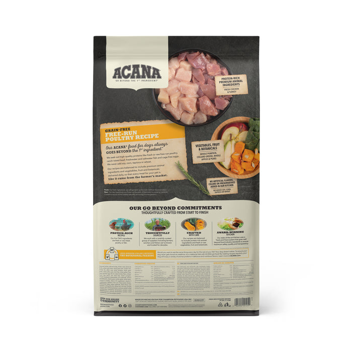 ACANA®recipes are thoughtfully crafted recipes from start to finish. ACANA Free-Run Poultry recipe is balanced with 60%* quality animal ingredients like free-run chicken and turkey**, cage-free eggs, and 40%+ fruits, vegetables, and botanicals. Artificial colors, flavors or preservatives are never added in our kitchen.
