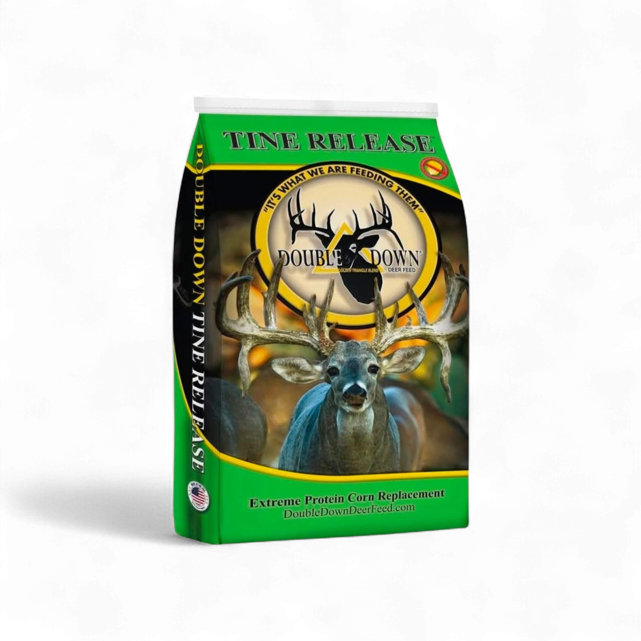 Double Down Tine Release is a new, high-protein, extruded deer feed from Double Down Deer Feed designed as a healthier, more nutritious replacement for traditional corn in spin-cast and broadc