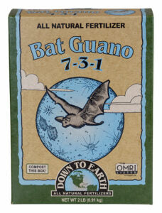 Bat Guano 7-3-1 is rich in nitrogen, phosphorus and potash and provides essential plant nutrition for vigorous vegetative growth and prolific fruit and flower development. DTE Bat Guano 7-3-1 is highly effective mixed into soils, applied as a side dress or steeped to make a potent guano tea or foliar spray.