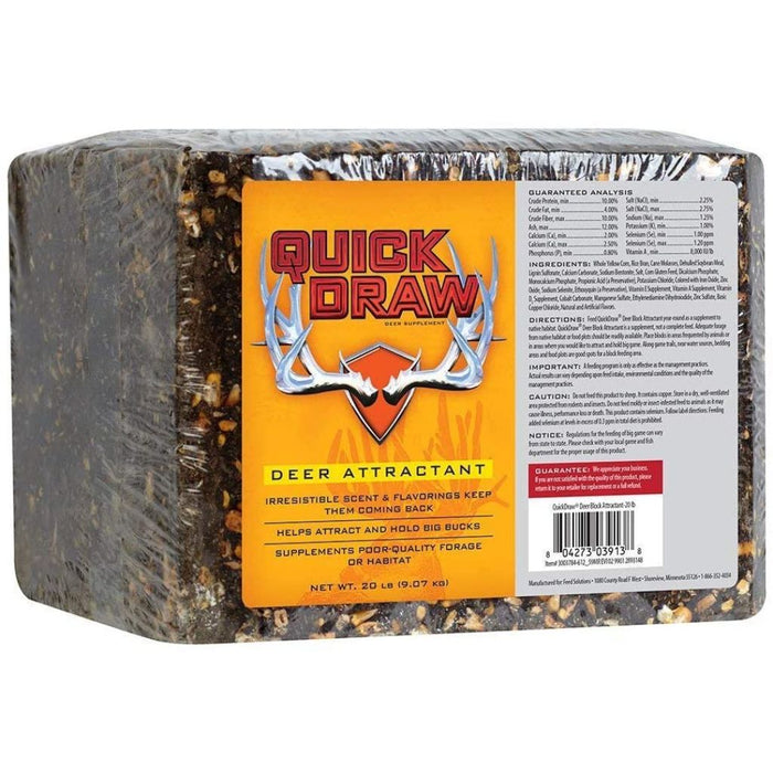 Designed to attract deer with its irresistible scent & flavorings. Designed in a 20 lb block, it attracts big bucks and helps keep deer coming back. It can also be used to supplement poor quality forage or habitat. Studies on the Quick Draw Deer Block attractant show strong consumption, driven by a proprietary flavoring agent not found in any other deer block.