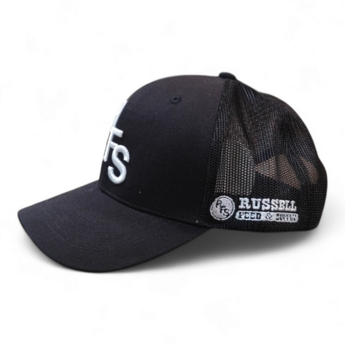Mesh back adjustable (snap-back) hat, black with RFS in white embroidery on front Russell Feed & Supply logo-type on side.