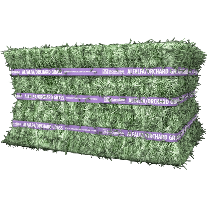 Premium Orchard Grass Compressed Bales are formed by allowing Standlee forage to grow to the proper stage of maturity, cutting the plants, allowing them to sun-cure (dry) to an acceptable moisture level and baling the forage at the optimal time. Standlee Premium Products creates compressed bales of forage from a large 4'x4'x8' bale that is put through a press, sliced horizontally, pushed onto a scale, weighed, compressed and then banded. Orchard Grass forage is typically slightly higher in protein and calories compared to Timothy and can be moderate to high in sugar content.