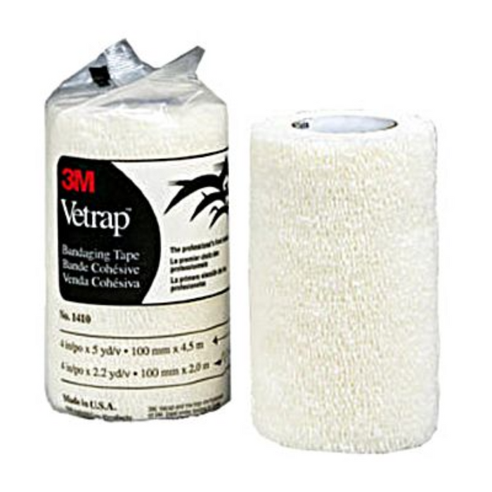 Vetrap, 4 inches x 5 yd, white, bandaging tape, firmly supports sprains & fractures, protects wounds & holds sterile dressings in place, adheres to itself without adhesive, no additional fasteners necessary, conforms snugly around contours that are most difficult to bandage, accommodates movement without loosening, won't stick to hair, allows skin to breathe through its cool, lightweight, porous material, absorbs virtually no moisture, cuts away with scissors without unwrapping